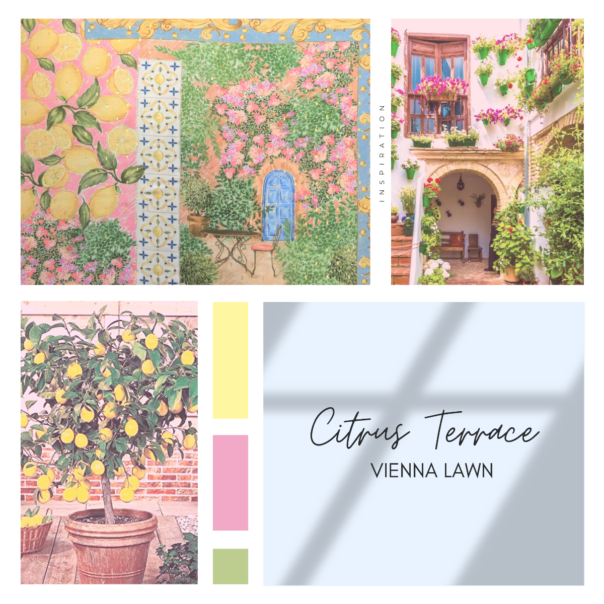 Inspired by summery Spanish citrus terrace gardens, this gorgeous illustration style print is not one to miss! Lady McElroy Citrus Terrace is a stunning blend of lemon yellow, sky blue, summer green, ivory, apricot and candy pink.