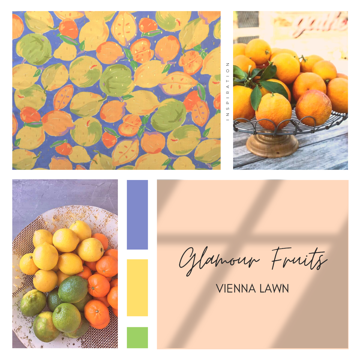 This vivid citrus fruits print will be a stunning addition to any wardrobe! Lady McElroy Glamour Fruits is inspired by summery fruits and weather, and is a beautiful combination of bluebell blue, lemon yellow, apricot orange, and lime green.