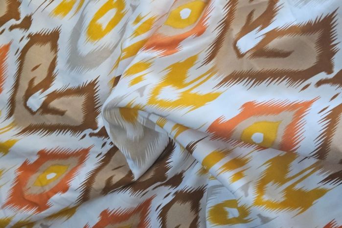 A Lovely Digital Ikat Print in Tones of Yellow, Orange, Tan, Light Grey and White on a Beautifully Soft 100% Viscose Challis Lawn.